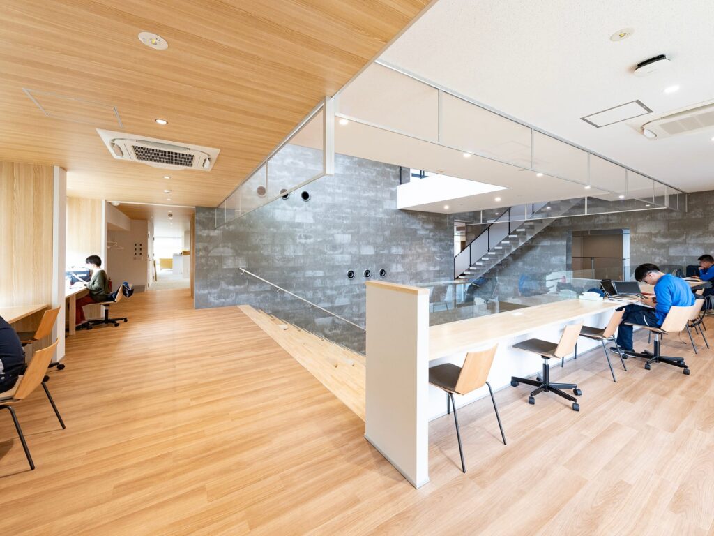 大きな吹き抜けと大階段が印象的な開放的な空間。用途に応じて自由に働く場所を選べる環境を実現しました。