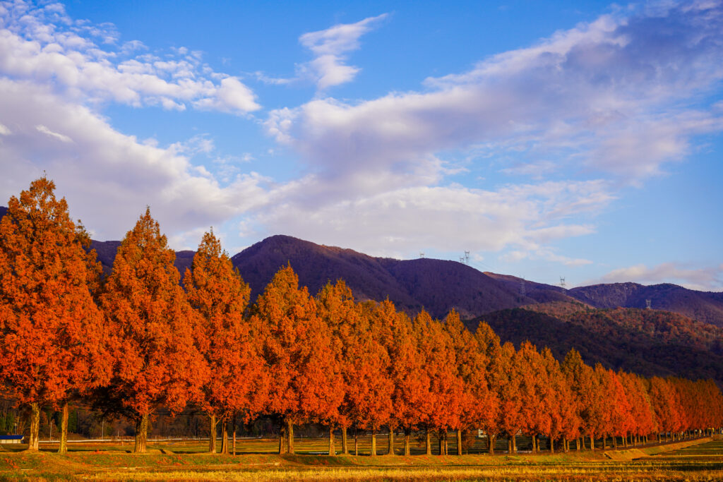 また、四季折々の美しさで知られる「メタセコイア並木」もぜひ訪れてほしいスポット。並木道を抜けるたびに、季節の風景がやさしく心を包み込みます。