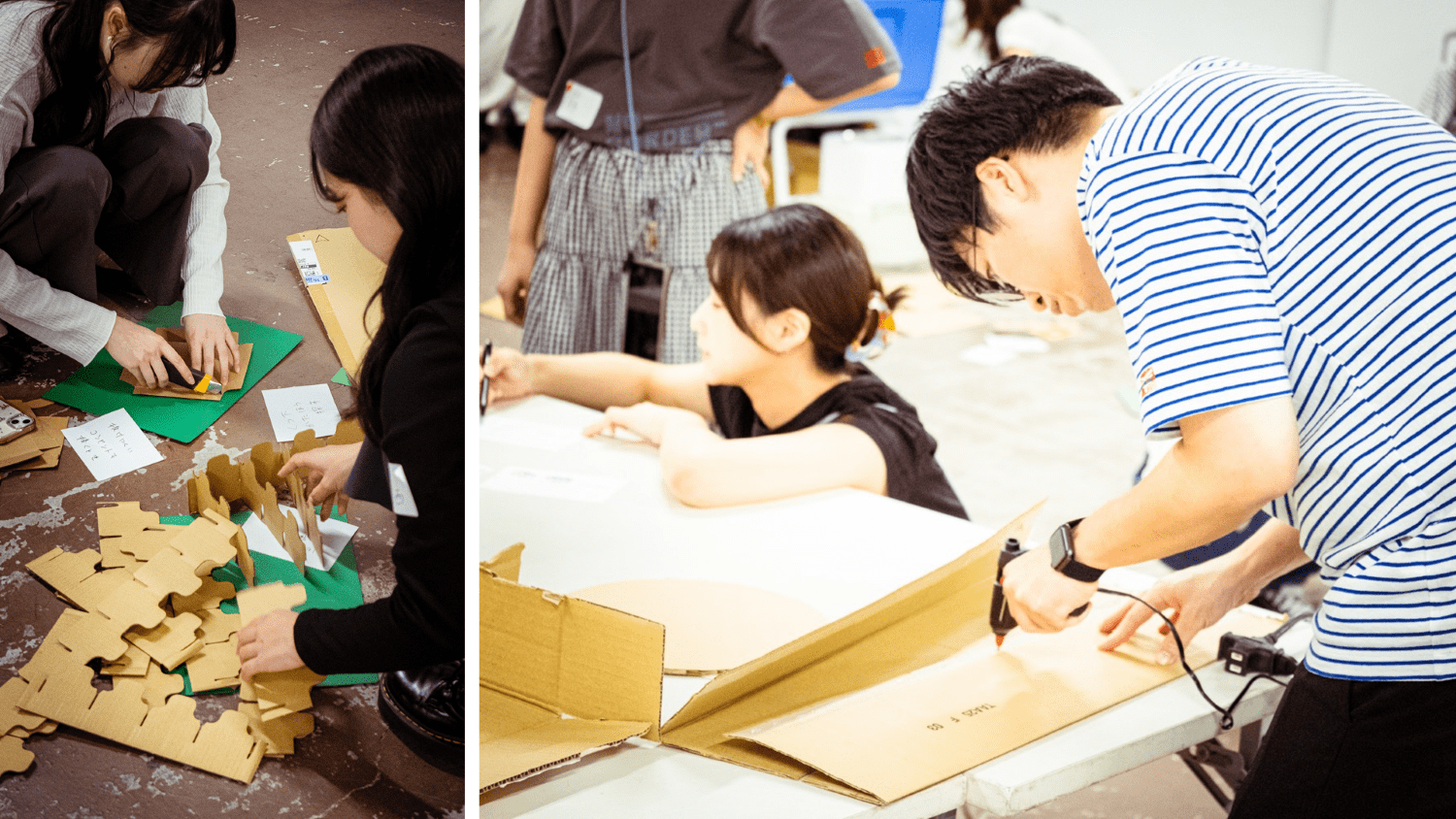 こういう工作をする時、自分はとにかく時間を掛けてしまいがちなのですが、「早く形にすることが大事」と言われたので、真っ直ぐな線も、左右のバランス調整も気にせず、思うがままにざくざくとダンボールをカットしていきます。あれ、イメージ通りにいかないな?そんな感情も一旦は置いておきます。
