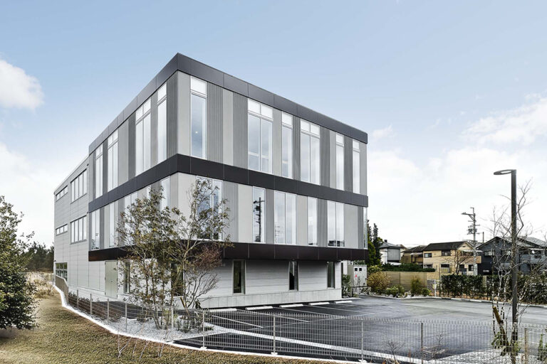 美容師夫婦の独立開業を、店舗付き住宅の設計施工からロゴのグラフィックデザインまでサポート。店舗らしい存在感のある外観がポイントになっている。シンプルなファザートの縦に連続する3つの窓で、上部まで突き抜けるスリットのような美しいラインを形成した。