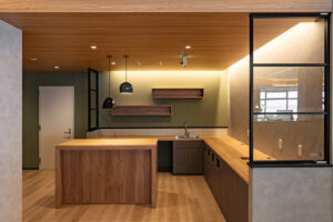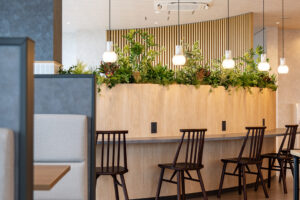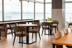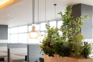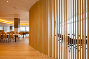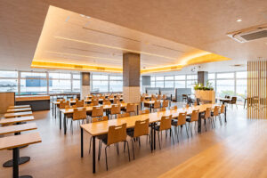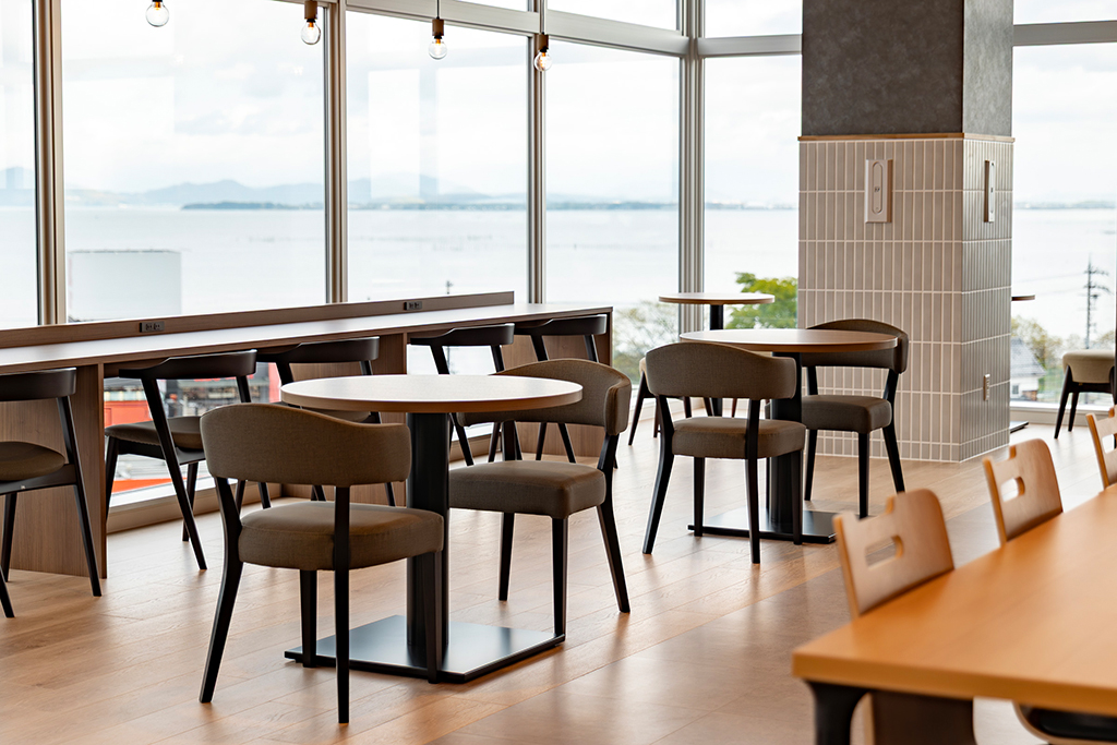 機能性の追求に加え、働く環境の質も重視。4階の食堂エリアは、びわ湖の眺望を活かしたリラックスできる空間としてデザインされ、機能的な工場の中に「人が生き生きと働ける場所」を創出している。