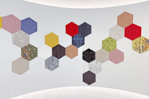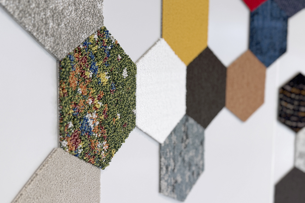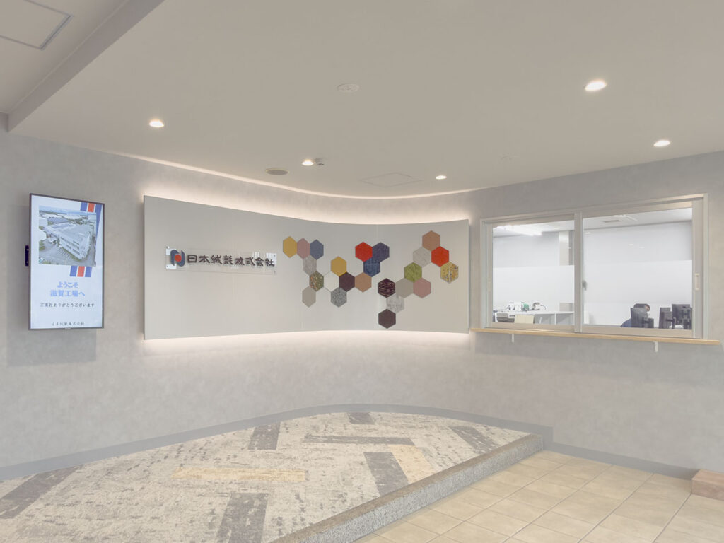 エントランスには自社製品のタイルカーペットを加工したパネルを配置。工場見学に訪れる顧客に対して、インテリアメーカーとしてのデザイン力や技術力を感じていただける空間となっている。
