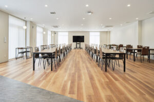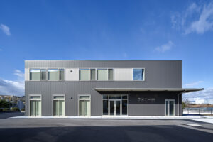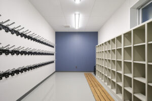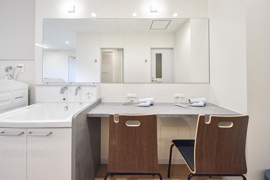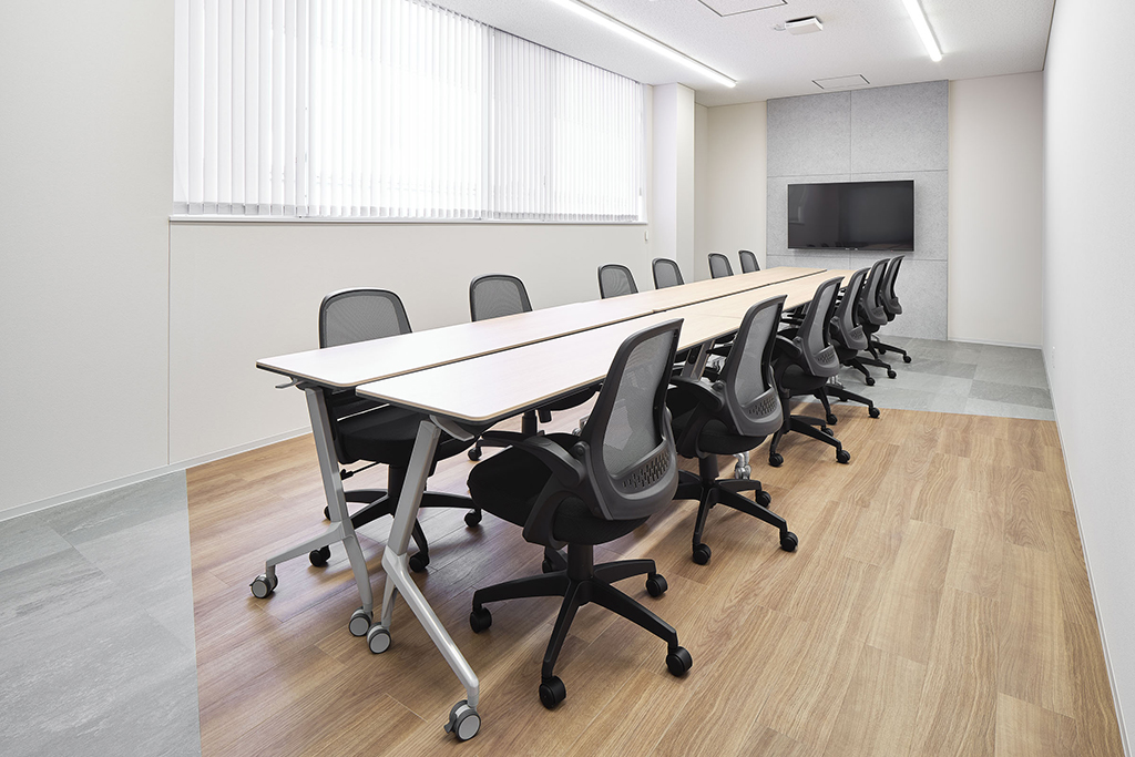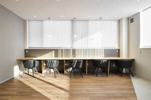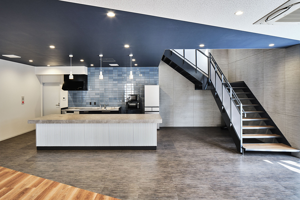 企業カラーであるブルーを落ち着きのあるネイビーを再解釈して取り入れた天井デザインや、自然素材と無機質な素材の対比が、空間に深みとリラックス効果をもたらしている 。リフレッシュコーナー(フリースペース)は、従来の更衣・食事機能に加え、勤務時間中もフレキシブルに使える開放的な空間とし、社員のウェルビーイング向上に寄与する 。
