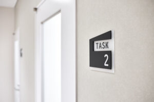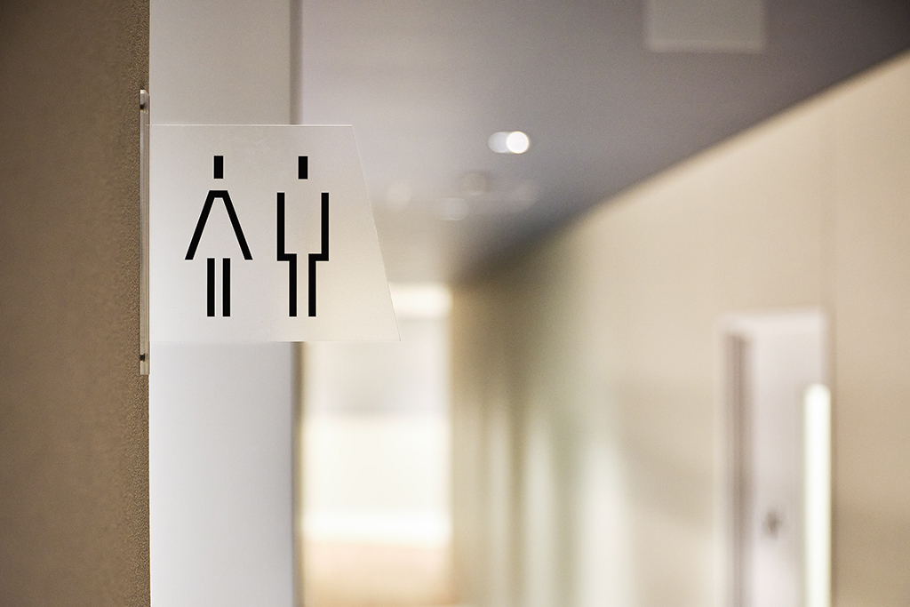 オリジナルの室名サインは建物の形状をモチーフに製作され、細部にまでブランドストーリーを宿らせている 。